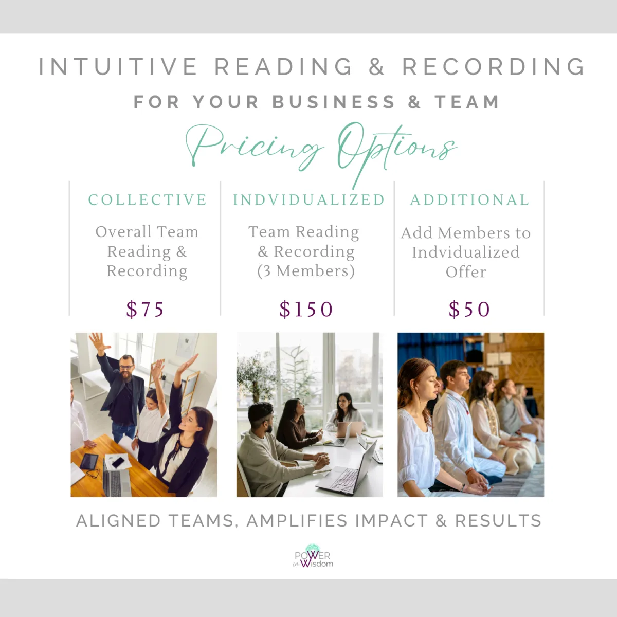 Individual Energetic Readings: (15 minutes per team member). Intuitive energetic reading and alignment check-in. Identification of blocks, beliefs, or imbalances preventing flow.